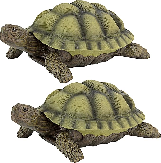- Our set of two cute tortoise sculptures measure 7"Wx9"Dx3"H. 1 lb. each making them ideal outdoor animal ornaments to welcome guests on your front yard lawn or hiding around a patio or pond