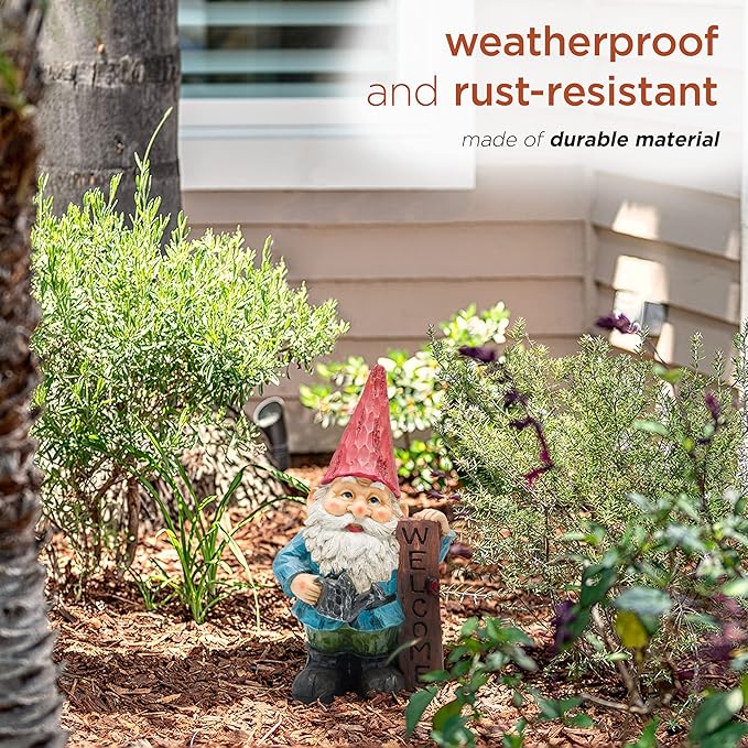- GARDEN STATUE: Lawn figurine featuring a brightly colored, playful, and magical yard gnome holding a welcome sign, will bring fun and a warm welcome to your front yard, garden, or patio