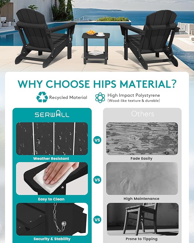 - Weather Resistant: Made of high-quality HIPS material, SERWALL Adirondack Chair incorporates advanced color retention technology that ensures the chair's durability and resistance to fading, cracking or peeling when exposed to harsh weather conditions.