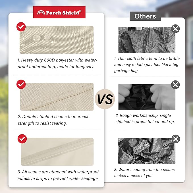 - Fadeproof & Waterproof Material - It is made of 600D tough polyester with waterproof undercoating. UV resistant treatment makes it stay vibrant for years. Enhanced with double stitched and sealed seams to prevent the outdoor table cover against sun, rain, snow, wind, and dust.