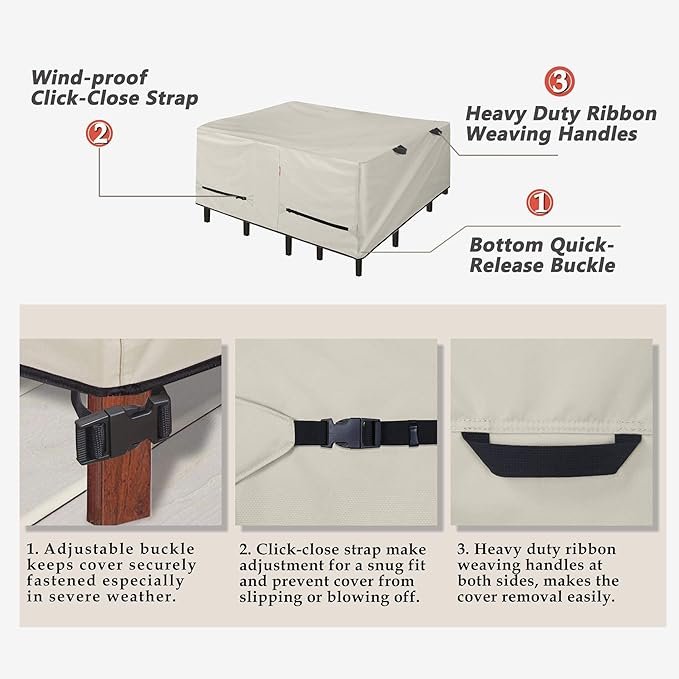 - Easy to Use - Heavy duty ribbon weaving handles make the cover easy to install and remove. No more to move your patio furnitures under shelter each time. Put the cover on will keep them look like new.