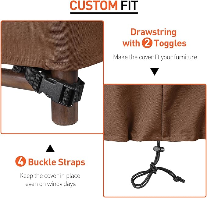 - CUSTOM & SECURE FIT - The adjustable drawstring closure keeps the patio cover snug and tight around your metal swivel chair. The buckle straps provide exceptional security and keep the cover firmly attached to your outdoor deep seating chair on windy days.