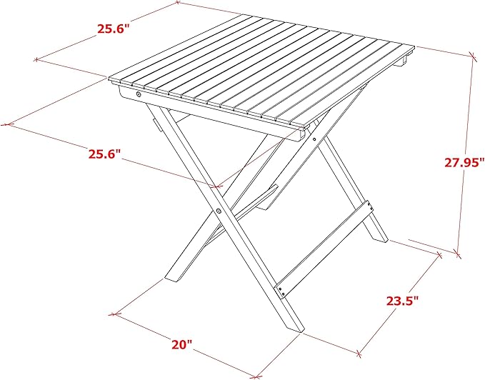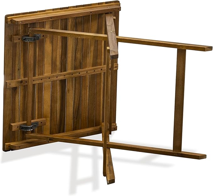 - ITEM DIMENSION: Dimension of this Gorgeous Wood Table is: Length: 25.60; Width: 25.60; Height: 28. And the Dimension of Folding Patio Chairs is: Length: 23; Width: 20.90; Height: 35.40. Our outdoor bistro table set comes in easy parts that are easy to assemble in a short time. Easy-to-follow instruction is included in the package, and no added tools are required for assembly.