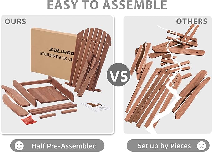 - PREMIUM HEMLOCK WOOD: SoliWood outdoor folding adirondack chair is using selected solid wood, every piece was well selected and with brushed finishing, giving you premium and royal feel when sitting on it