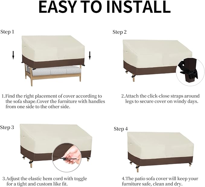 - All-Round Protection: The furniture cover can protect your sofa from rain, sun, snow, wind, dust, etc. Fasten click-close straps around furniture leg can prevent the cover from being blown off on windy days. Elastic hem cord with toggle allows for a tight and custom-like fit.
