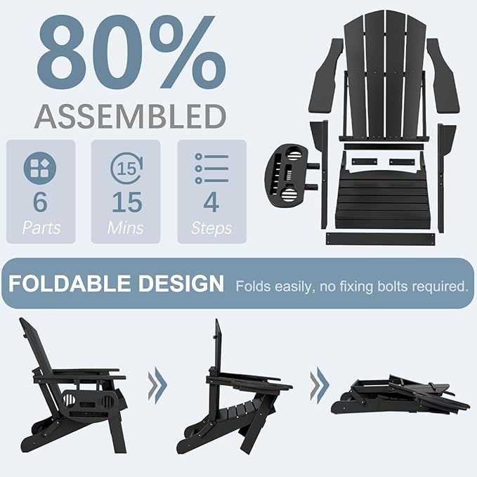 - ☘️【Multifunctional Cup Holder & Folding Function】We have improved upon the traditional Adirondack chair by installing a multifunctional cup holder on the right side of the chair. There's plenty of room for your favorite beverage or media device. It can store iPads, mobile phones, books, wine glasses, tea cups and drinks! Easy to fold, just remove the pins on both sides of the chair and it folds flat for easy transport and storage!