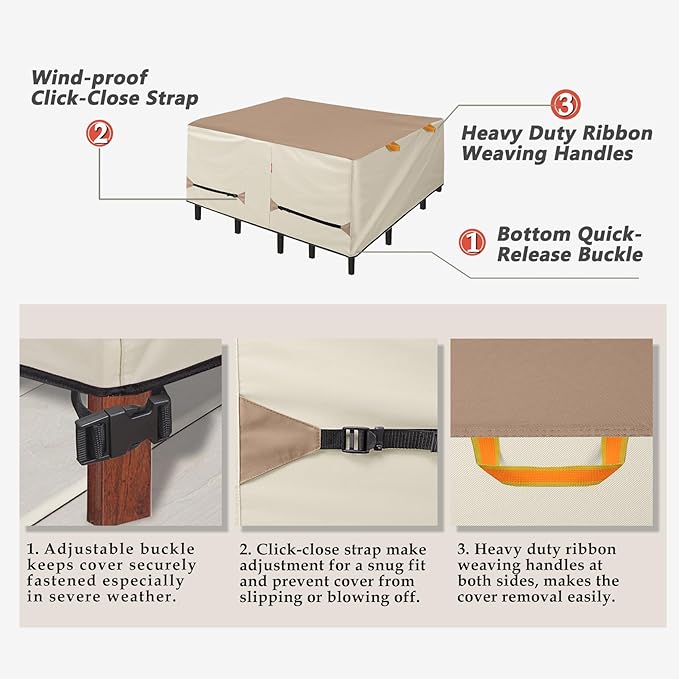 - Easy to Use - Heavy duty ribbon weaving handles make the cover easy to install and remove. No more to move your patio furnitures under shelter each time. Put the cover on will keep them look like new.
