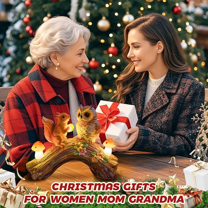 Solar Owl Garden Statues Outdoor Decor Resin Owl Squirrel Figurine with Mushroom Lights for Patio Lawn Yard Decorations Christmas Birthday Housewarming Gardening Gifts for Women Mom