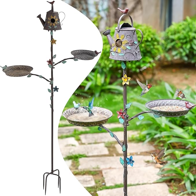 - ๐ธ 3-in-1 Birdbath and Birdhouse - Discover the captivating 3-in-1 bird bath feeder and bird house combo that effortlessly transforms your garden into a vibrant avian haven. This ingenious design integrates a charming watering can-shaped bird house, 2 shallow bird baths or bird feeders trays, and a sturdy 4-prong stake, creating a convenient and space-saving solution to attract feathered visitors to your outdoor space.