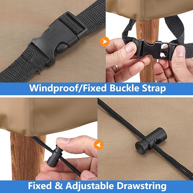 - Easy to use: There are two wide padded handles for you to install and and remove the cover easily. The outdoor couch cover is designed with four click-close straps and cord-lock closure at bottom to keep the cover attached to the sofa legs.