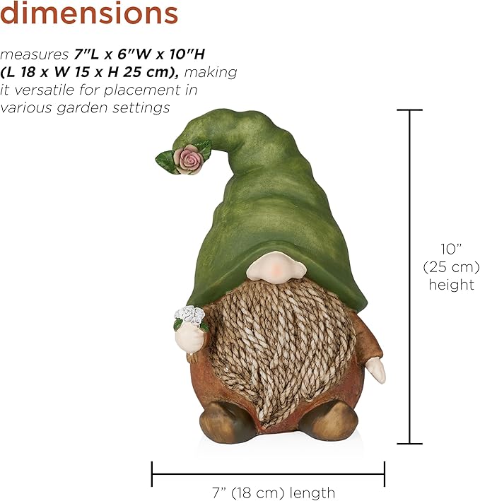 - IDEAL DIMENSIONS: With measurements of 7"L x 6"W x 10"H, this gnome statuary is a compact yet eye-catching feature for your outdoor space