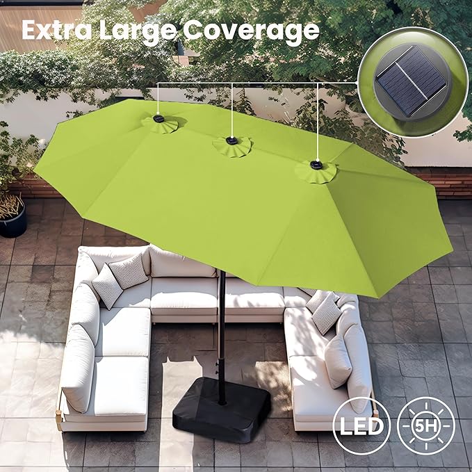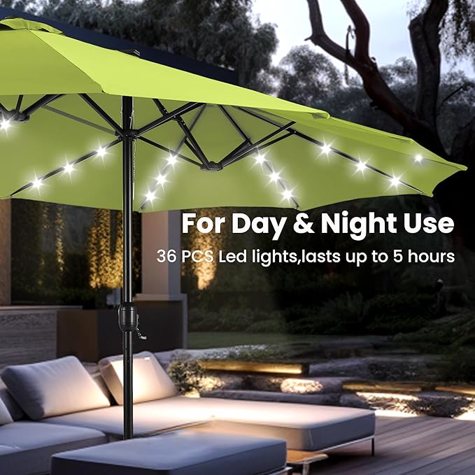 PHI VILLA 15 ft Umbrella Outdoor Patio Solar Lights with Base, Outdoor Double-Sided Large Market Rectangle Umbrellas with 36 LED Lights, Lime Green