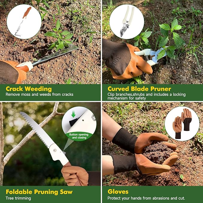 - Garden Tool Sets: The garden tools for gardening comes with folding saw, serrated trower, small trowel, cultivator, hand rake, pruner, weeder, gardening gloves and an tote bag. Made from high-quality aluminum alloy, our gardening tools are built to last and withstands the rigors of frequent use in the garden. With garden gloves for hand protection, the 10 pieces garden kit are easier to fix up your garden.