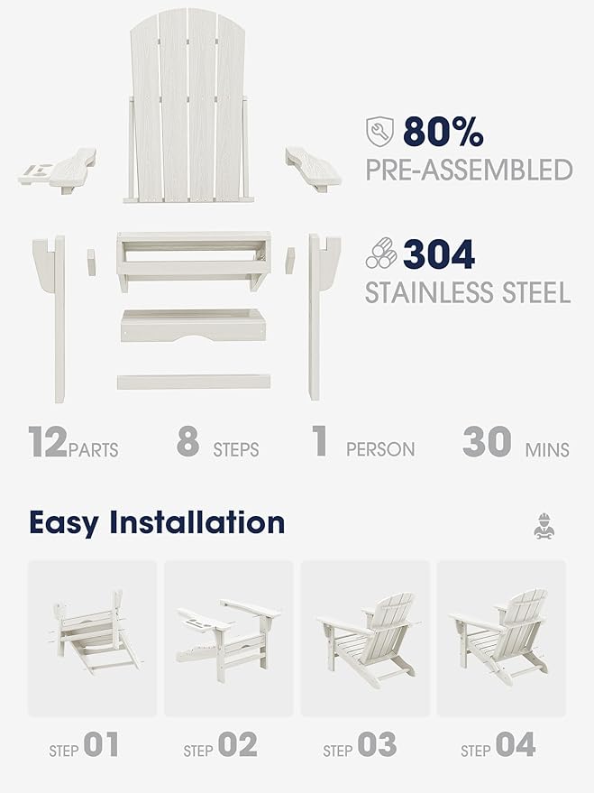 - Easy Assembly- The KINGYES Folding Adirondack Recliner with Ottoman comes with all necessary hardware and a clear assembly guide, making it simple to set up. Spend less time assembling and more time enjoying your outdoor space.(Tip: Please do not over tighten screws until assembly is complete.)
