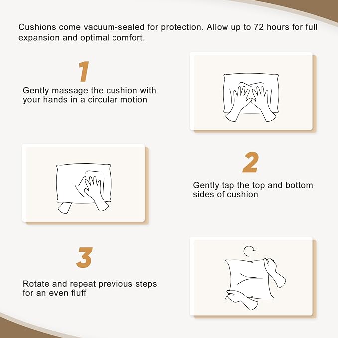 - COMFY CUSHIONS: Designed to last, the cushions are filled with a plush yet supportive sponge that resists sagging, ensuring lasting comfort for any indoor or outdoor seating arrangement. The removable covers, made from soft, breathable polyester, are stain-resistant and machine washable, making maintenance a breeze