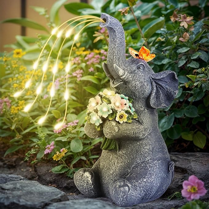 - ใ๐๐๐๐ ๐๐ฅ๐๐ฉ๐ก๐๐ง๐ญ ๐ ๐๐๐๐๐๐๐๐ใCute and adorable elephant solar garden statue figurine . This solar garden elephant with flowers will into your heart. Its design is unique, and a vivid elephant garden statue sitting in the backyard, which makes you surprising. it is a great solar elephant decor to your garden, ponds, patio tables, steps, flowerbeds, plant pots, windowsills, or anywhere you like.