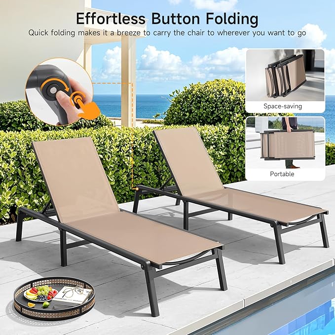 - Quick Folding Up: Our lounge chair outdoor features a convenient button folding design. Without parts removal, simply press the button to effortlessly fold it up to a compact size in seconds for storage or transportation, making it space-saving for small courtyards and easy to take with you on the go