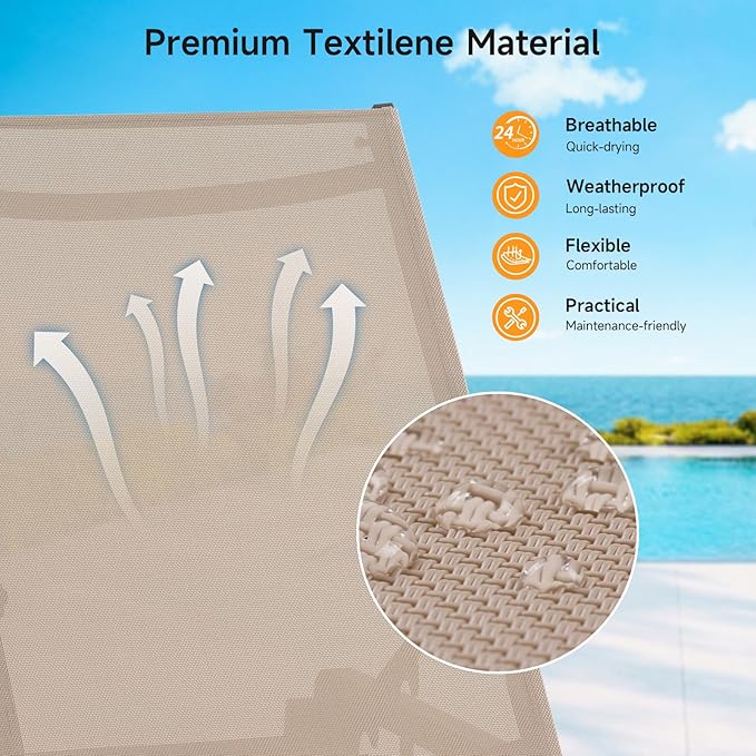 - All Seasons Available: Crafted with premium Textilene fabric, our outdoor chaise lounge is weather-proof and quick-drying for all-season use. Good flexibility and breathability are provided to keep you cool on hot days. Cleaning is a breeze, just wipe with damp cloth to get easy maintenance and ultimate comfort