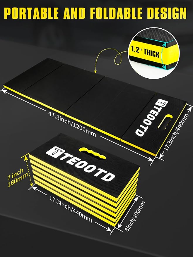 - ✅【Compact Foldable Design】Folds seamlessly in seconds! Store neatly in closets, car trunks, or tight spaces. Three versatile sizes: Fully unfolded (47.3’’x17.3’’x1.2’’/1200x440x30mm), half-folded (26’’x17.3’’x2.4’/600x440x60mm), or fully folded (17.3’’x8’’x7’’/440x200x180mm). Ideal for workshops, cleaning, camping, and DIY projects.