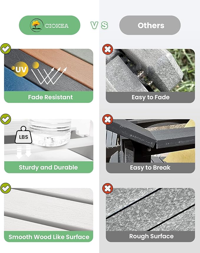 - Strong and Sturdy: Our plastic adirondack chairs are made of wood garin HDPE material, which is more resilient. When impacted by strong gravity, the CIOKEA HDPE plate will bend slightly and recover as the gravity disappears, while ordinary HDPE plate will bend severely and fail to recover, and HIPS plate will break. Ciokea Adirondack chairs can have a load capacity of 380LBS