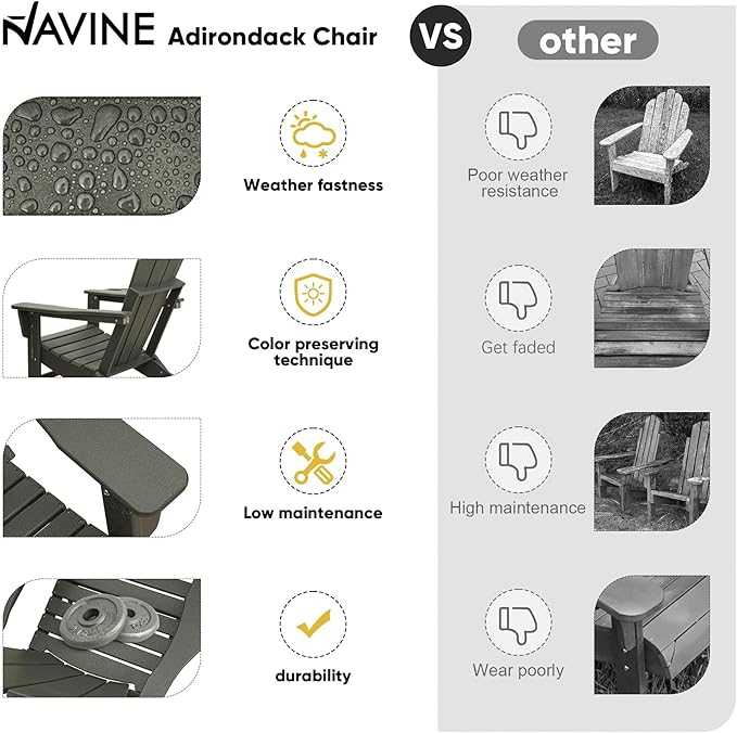 - ☘️【Strong and Durable】Our Adirondack chairs are made from all-weather materials to withstand all seasons and a range of climates, including hot sun, snowy winters, salt spray and strong winds. Will not fade, chip, crack, peel or rot. It's clear and clean with just water and soap, no need to paint, stain or waterproof.