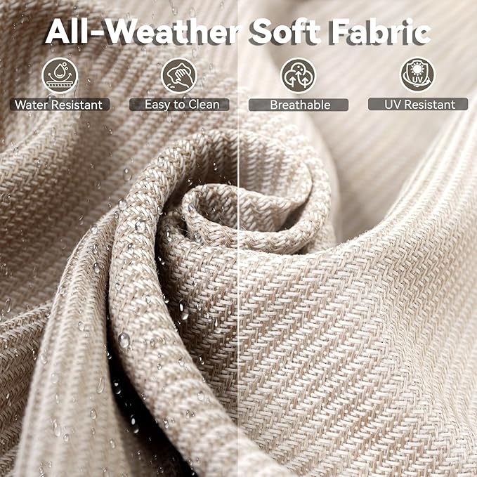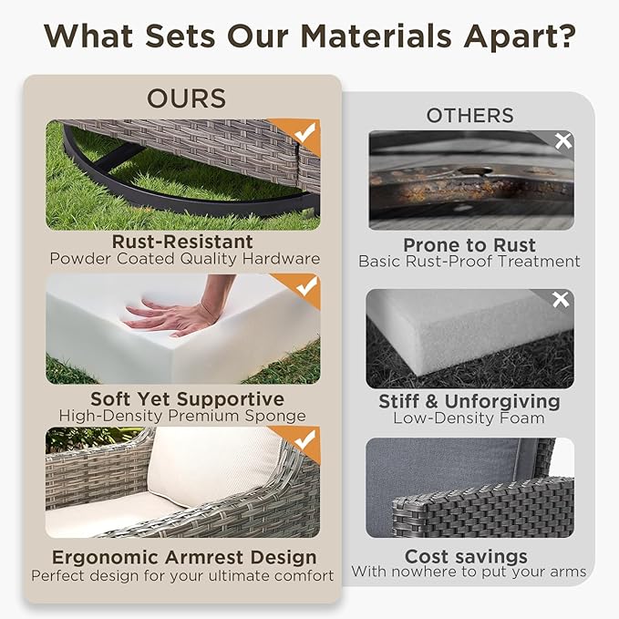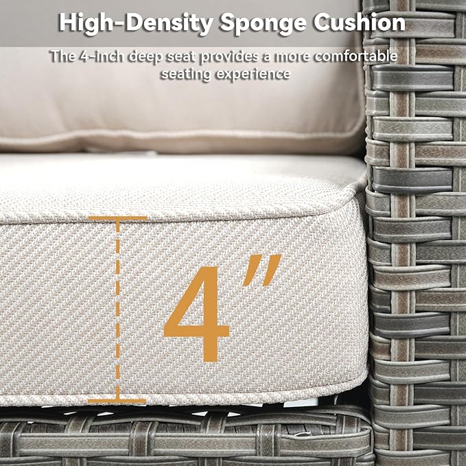- 【Comfortable and Thick Cushion】Our wicker patio furniture features 4-inch thick cushions made with soft, high-density sponge that offers comfortable support and won’t flatten over time. The cushions are designed for long-lasting comfort, providing both softness and resilience. Covered in durable Olefin fabric, a professional outdoor material, they are water-resistant and built to withstand the elements, ensuring a comfortable seating experience for hours