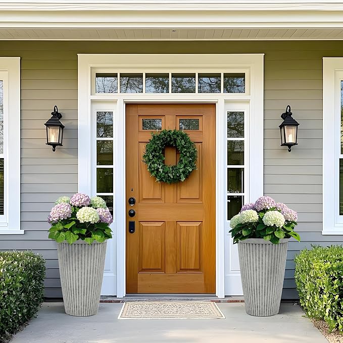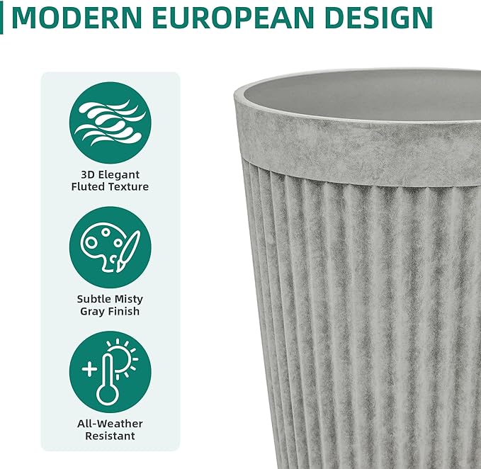 - Timeless Elegance Design: This set of 2 tall planters features a tapered round shape with a handcrafted misty gray finish and elegant 3D fluted texture. Combining vintage charm with modern sophistication, these pot planters brighten up your garden, patio, or indoor spaces. Ideal for displaying vibrant flowers, lush plants, and fragrant herbs, they create a serene and inviting atmosphere in any setting.