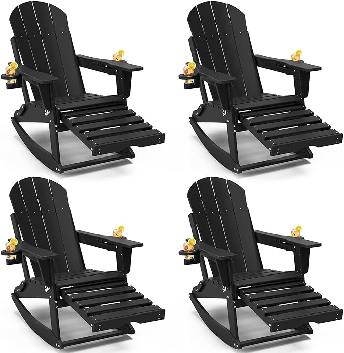 Adirondack Rocking Chairs Set of 4 with Retractable Ottoman, All Weather Folding Adirondack Chair with Two Cup Holders, Adirondack Outdoor Rocking Chairs for Porch, Patio, Balcony. Black