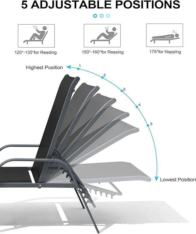 - Ultra Comfort Provided: Ergonomic outdoor chaise lounge supplies maximum comfort. Equipped with adjustable back (5 positions and lay flat), you're able to choose the most comfortable position according to your preference. Moreover, smooth armrests provide reliable support to help you get up.