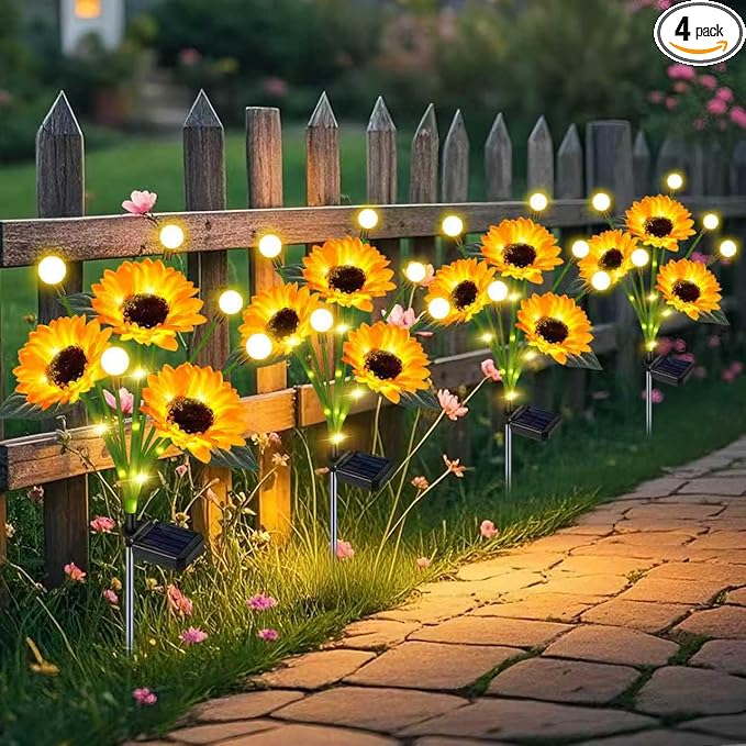 - Sunflower & Firefly Fusion Solar-powered yellow sunflower heads with twinkling firefly lights in durable outdoor decor creating dreamy garden ambiance