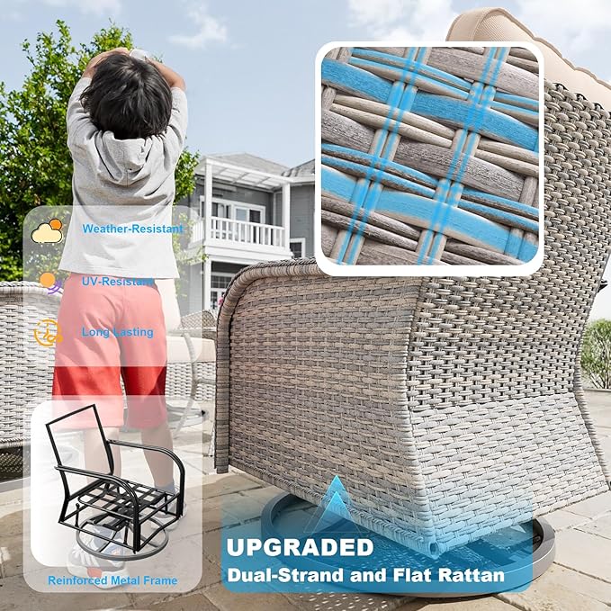- Sturdy Frame & All-Weather Dual-Strand Wicker:Each chair is handwoven with upgraded dual-strand + flat PE rattan, wrapped over a heavy-duty powder-coated steel frame. This high-tensile, UV-resistant wicker ensures superior weather resistance, fade resistance, and long-term durability in any outdoor environment.