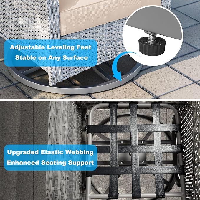 - Adjustable Leveling Feet:No more wobbling! Equipped with adjustable leveling feet on each base, these outdoor swivel chairs stay balanced even on uneven floors like tiles or wood decking. The sturdy circular base also provides enhanced stability during rocking and spinning.