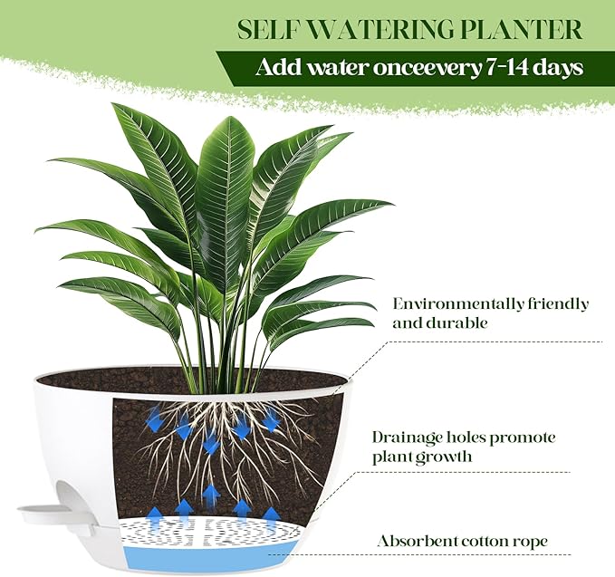 - ✅ 2 Large Self-Watering Planters: Double the value! Includes two 10-inch wide plastic hanging planters with built-in self-watering reservoirs to reduce the need for frequent watering and keep plants healthier.