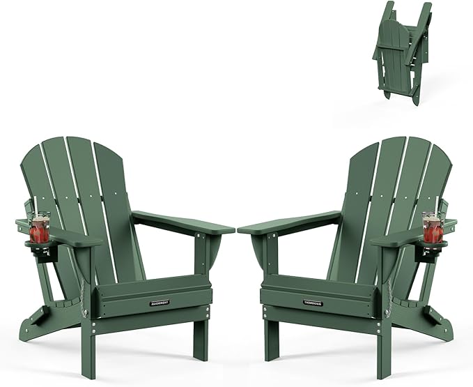 MUCHENGHY Folding Adirondack Chairs Set of 2, Patio Chairs, Lawn Chairs, Outdoor Chairs, Adirondack Chair Plastic, Fire Pit Chairs, Weather Resistant with Cup Holder for Deck, Backyard, Garden(Green)