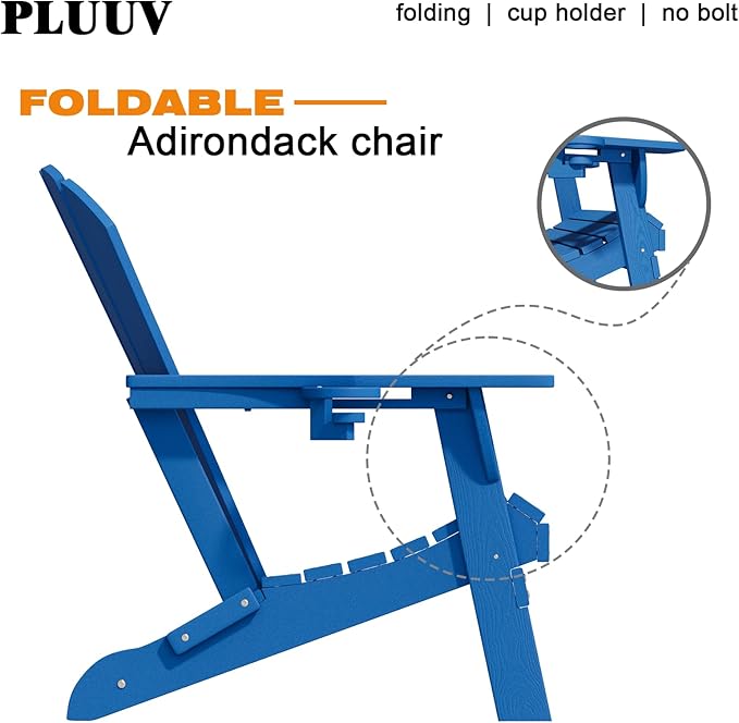 Folding Adirondack Chairs with Cup Holders, Set of 6 HDPE Plastic Outdoor Chairs, Weather Resistant, Real Wood Look, Heavy-Duty Patio Furniture for Deck, Fire Pit, Backyard, Blue