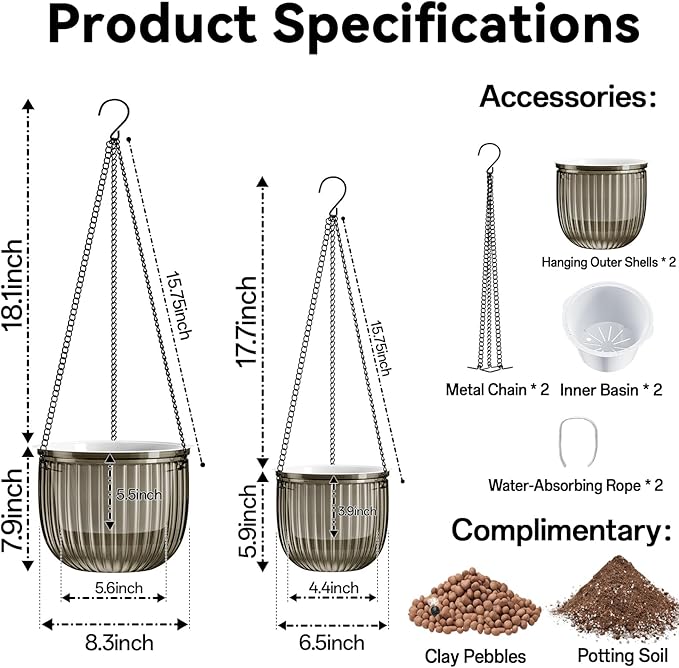 - ๐๐๐๐ค๐๐ ๐ ๐๐ง๐๐ฅ๐ฎ๐๐๐ฌ: You will receive a two-piece 6.5inch and 8.3inch starry gray self watering hanging planter set, complete with all accessories, plus complimentary potting soil and leca balls for plants