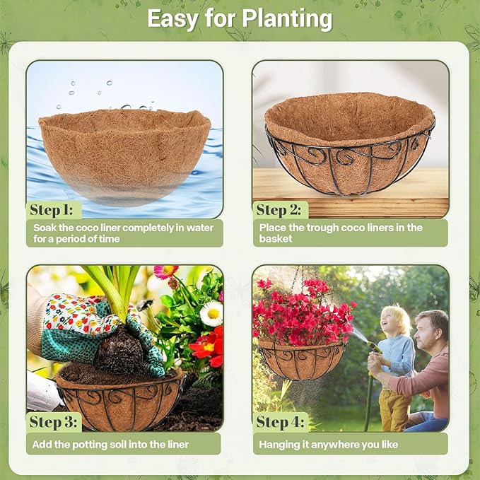 - Easy Setup and Versatile Use: Each hanging basket comes with pre-attached chains and quick-setup hooks. Simply soak the coconut liner, place it in the metal basket, add potting soil, and plant your favorite flowers or greenery. The hanging design allows for flexible positioning to maximize sunlight exposure.