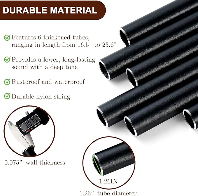 - 48 Inch Deep Tone Wind Chimes: 48 Inch Deep Tone Wind Chimes: Crafted with 6 aluminum tubes (tube lengths from 16.5" to 23.6", a diameter of 1.26", and a wall thickness of 0.075") tuned to a pentatonic scale, these 48-inch large wind chimes produce rich, deep tones that linger like a calming whisper. Their serene sound fosters peace and a connection to memories. Let soothing melodies turn your garden into a serene sanctuary.