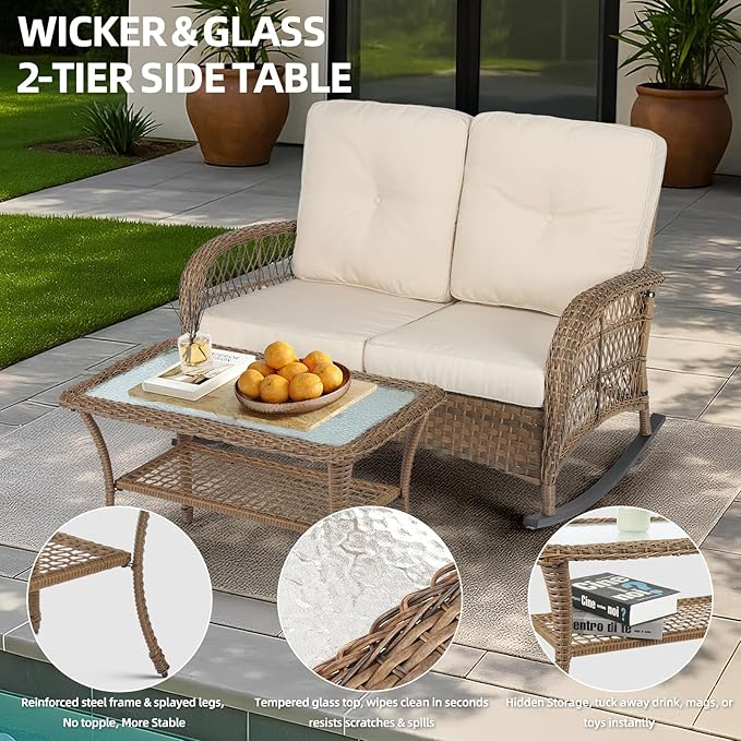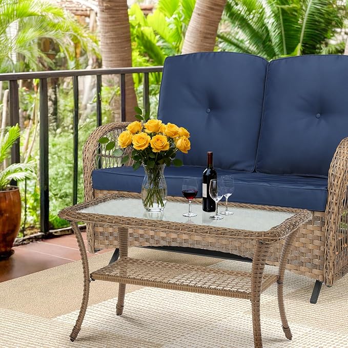 - 【Classic 2-Tier Storage Design】This outdoor coffee table features a practical double-layer design that offers more space than ordinary side tables. The upper glass tabletop is ideal for snacks, drinks, or coasters, while the lower shelf provides extra storage for magazines, sundries, or other essentials. Perfect for enhancing any outdoor space such as the garden, deck, backyard, or poolside.
