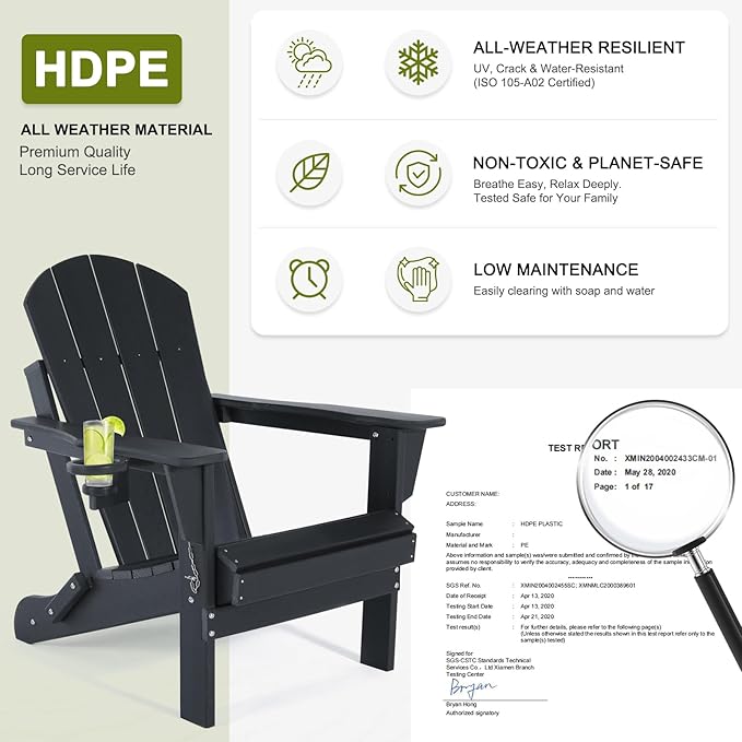 - 【Eco-Safe】Our folding adirondack chairs passes rigorous tests including RoHS 10, PAHs, and phthalates, with lead and cadmium content well below international limits, ensuring safety in use and minimizing environmental harm from hazardous substances.