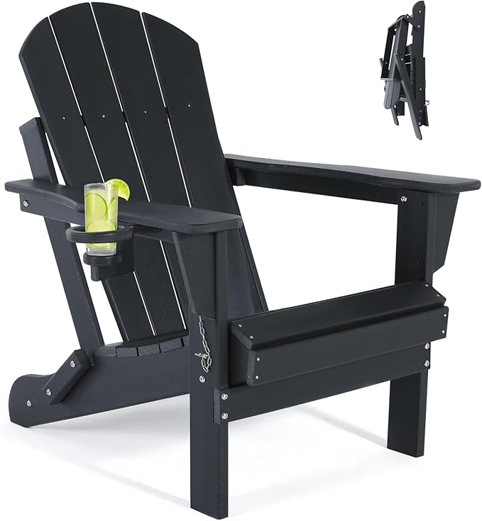 Folding Adirondack Chairs - Plastic Adirondack Chair with Cup Holder, Outdoor Chairs Weather Resistant for Outside, Patio, Lawn, Garden, Backyard Deck, Fire Pit - Black