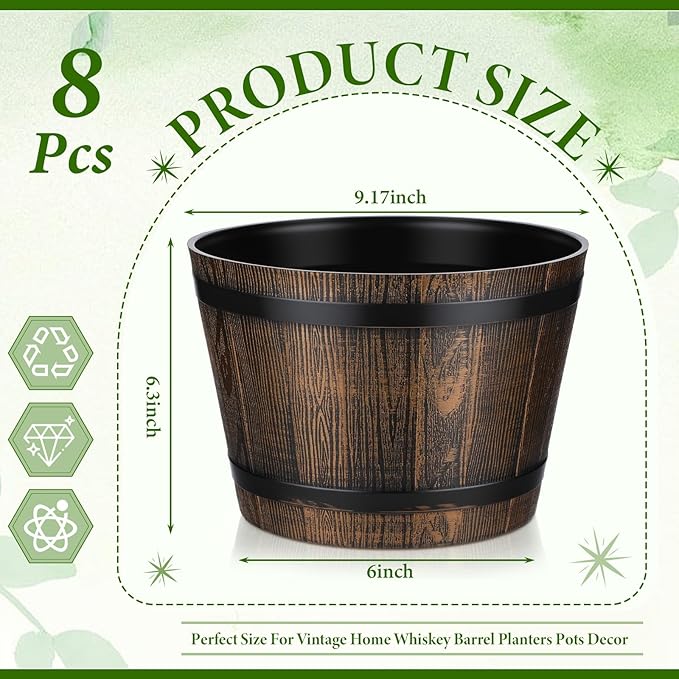 8 Pcs 9.17inch Plant Pots Whiskey Barrel Planter Flower Pot with Drainage Holes Plastic Decoration Large Flower Pots for Indoor Outdoor Plants Garden Home Plants for All Houseplants