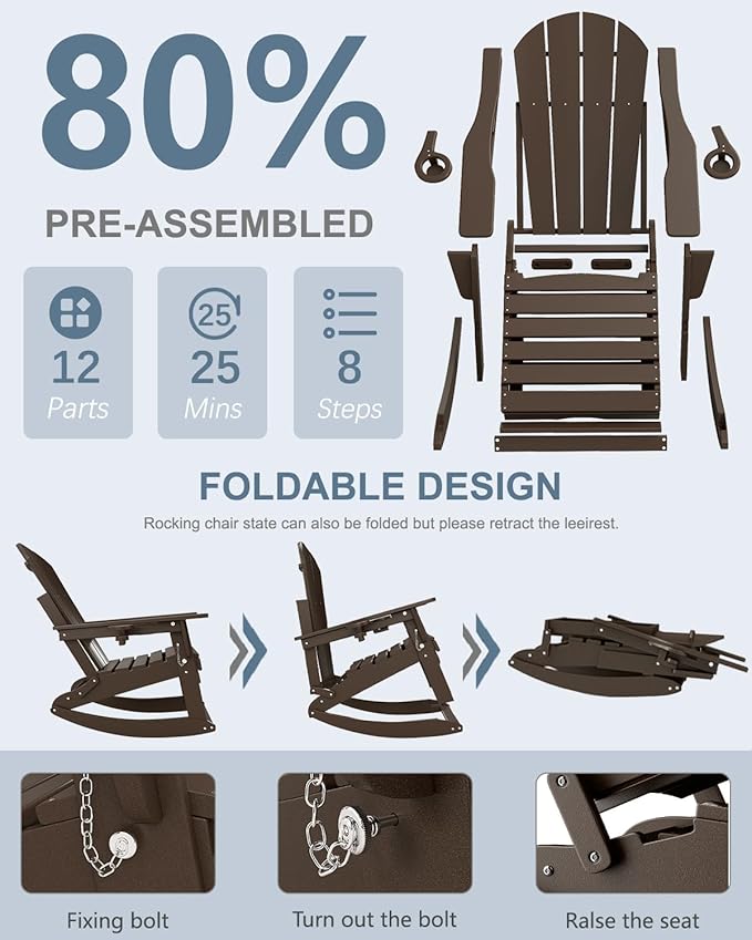 - REMOVABLE ROCKING BASE AND FOLDING DESIGN: Our Adirondack chair with footrest is equipped a removable rocking base. Its rocking arc is carefully calculated to provide you with a smooth rocking and ensure your personal safety. The rocking base can be also removed, making the outdoor rocking chair become a folding Adirondack chair. Foldable Adirondack chair not only saves your storage space, but also provides great convenience to carry and transport.
