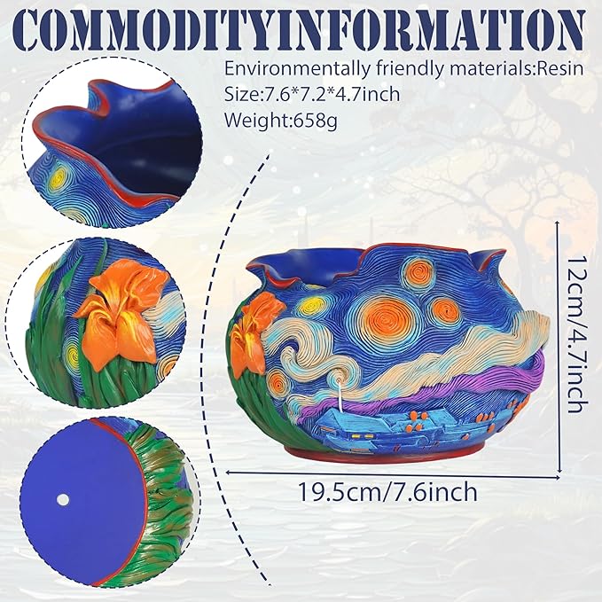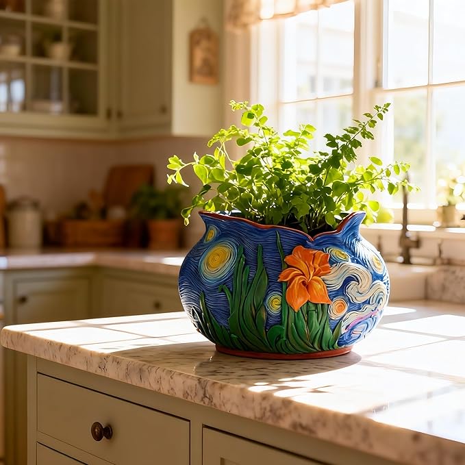- 【Starry Night Themed Planter】Bring Van Gogh's masterpiece to life in your home with our artistically crafted plant pots featuring three-dimensional swirling galaxies and a vibrant orange iris bloom. Measuring 7.6" in diameter and 4.7" in height, these flower pots transform ordinary greenery into breathtaking gallery displays. The celestial color palette of cobalt blue, gold, and ivory creates mesmerizing depth, making these planters for indoor plants perfect for adding artistic flair to windowsills, office desks, or outdoor patios.