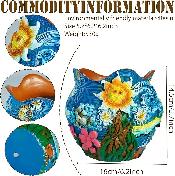 - 【Sunflower & Starry Night Inspired Plant Pots】Bring a masterpiece to your home with our artistically crafted flower pots that capture the vibrant energy of Van Gogh's sunflowers against a celestial blue backdrop. Each plant pot features deep cobalt blue resin adorned with three-dimensional golden sunflowers and swirling silver-white spirals, creating a stunning visual narrative.